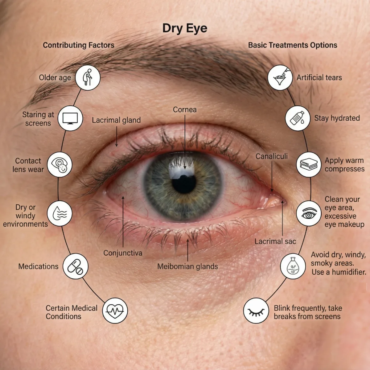 Dry Eye Syndrome can develop for several reasons. Common causes include reduced tear production due to aging or hormonal changes, increased tear evaporation caused by environmental factors like dry indoor air, wind, cigarette smoke, and prolonged computer screen use, as well as medical conditions such as Sjögren’s syndrome, rheumatoid arthritis, and thyroid disease. Eyelid conditions like blepharitis and meibomian gland dysfunction can also disrupt tear quality, causing tears to evaporate too quickly. Certain medications and contact lens use, especially wearing contact lenses for extended periods, may contribute to dryness in some individuals.