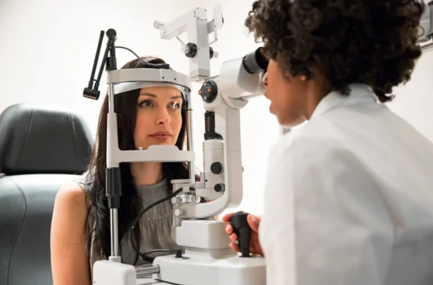 A slit-lamp microscope allows the eye doctor to closely examine the tear film and the surface of the eye. This helps identify areas of dryness or damage.